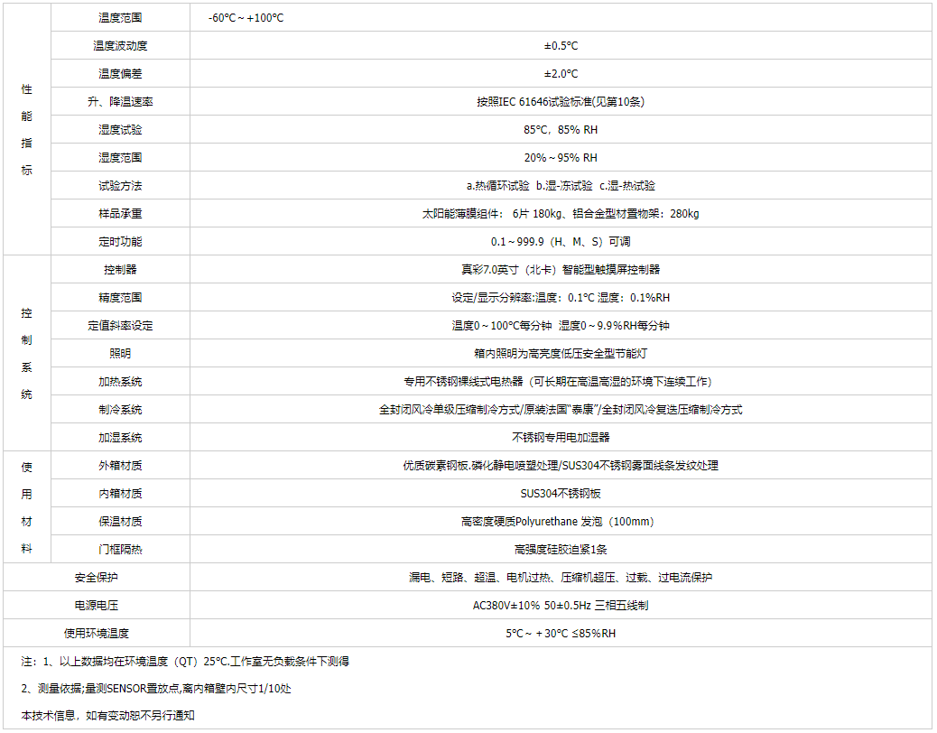 產品簡介:光伏濕凍試驗箱適用于光伏組件(太陽能電池板)做熱循環、濕凍循環、高溫高濕雙85試驗,以確認組件能否承受高溫高濕之后隨之的負溫度影響,以及對于溫度重復變化時引起的疲勞和熱失效,另外確定光伏組件曝露在高濕度下而產生的熱應力及能夠抵抗濕氣長期滲透的能力.是光伏組件行業必不可少的測試設備。