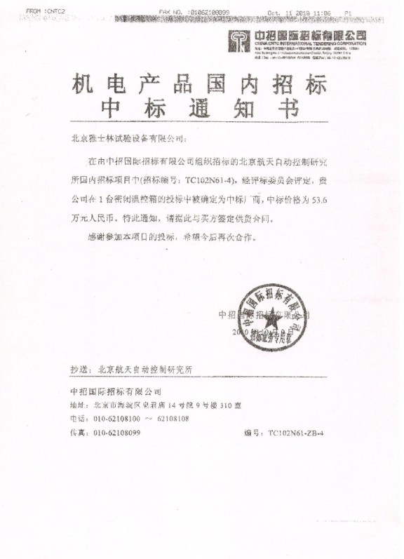 金秋十月,秋高氣爽!由中招國際招標有限公司精心組織,在北京航天自動控制研究所2010年國內項目二期招標中,北京雅士林試驗設備有限公司憑借強大的綜合實力,以各項排名指標均名列前茅的優異成績成功中標密閉溫控箱(招標編號:TC102N61-4)項目工程。中標金額為53.6萬元人民幣。