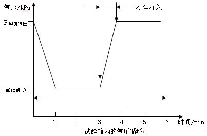 試驗用塵:試驗用塵是干燥的非磨蝕性的細粉塵,能夠通過篩孔為75µm,金屬絲直徑為50µm的平面網狀篩。本試驗中可以使用滑石粉,分析表明它可以滿足要求。試驗用塵使用次數不應超過20次。應注意維持干燥以保持粉塵細度,使用前應在80℃下烘干2h. 塵濃度:試驗用塵的數量應能夠使箱底基準表面上的沉降量均勻維持在(600±200)µ/(m²•h)。 氣流:試驗箱內的氣流應主要是自上而下的垂直氣流,而非層流。 氣流速度:氣流速度應能夠使塵在試驗箱內均勻分布。 濕度:試驗箱內的相對濕度應小于15%。可以通過提高試驗箱濕度實現。 樣品內氣壓:根據樣品的運行條件,樣品外殼可以分為兩種類型: 類型1:樣品外殼內的氣壓可能會與外界大氣壓不同,例如由運行中的熱力循環引起氣壓不同。 類型2:樣品外殼內的氣壓跟外界氣壓相同。 相關規范應闡明樣品外殼類型和壓力降。 砂塵試驗箱對于具有類型1外殼的樣品,應放入試驗箱,并按照正常使用位置安裝。樣品應承受圖中規定的壓降周期。根據相關規范中規定,壓力降應為2kPa(20mbar)或5kPa(50mbar) 。 如圖所示,塵應在每個循環周期內注入。 對于具有類型2外殼的樣品,應放入試驗箱,并按照正常使用位置安裝。此種情況下,不應使用真空泵。