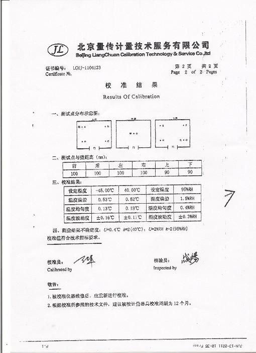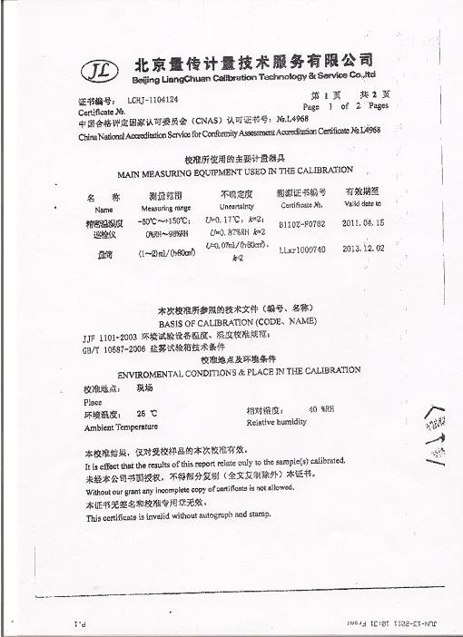 鹽霧腐蝕試驗箱校準證書-北京量傳計量-中安電子