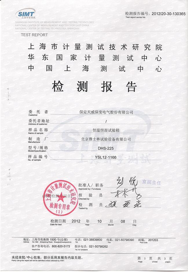 ·恒溫恒濕試驗箱檢測報告-上海計量院-天威保變