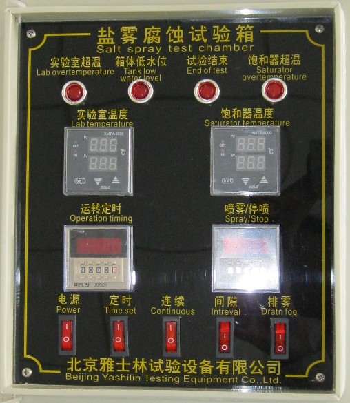 控制面板是鹽霧腐蝕試驗箱的心臟,試驗步驟都是通過控制面板上設定的,為了方便用戶對試驗箱的操作,下面為您講述控制面板功能說明: 實驗室超溫:當鹽霧試驗箱工作室溫度超過試驗設定值一定范圍時,此報警燈亮。 箱體低水位:鹽霧腐蝕試驗箱在試驗過程中缺水時,此報警燈亮。 試驗結束:當試驗運轉時間到達設定值時,此燈亮(設備停止工作)。 飽和器超溫:當飽和器溫度超出空氣開關設定值一定范圍時,此報警燈亮。 實驗室溫度:顯示試驗過程中實驗室的實際溫度和設定溫度。 飽和器溫度:顯示試驗過程中飽和器的實際溫度與設定溫度。 運轉定時:對試驗時間進行實時設定,試驗時間到達設定值,設備停止運轉。 噴霧/停噴:此定時器是噴霧時間設定、停噴時間設定、時間單位選擇。 排霧:試驗結束時,按下此按鈕,將試驗箱內的鹽霧氣體趕出,通過排霧口排出。 間隙:按下此按鈕,噴霧塔將按計時器設定的時間進行間隙性噴霧。 連續:按下些按鈕,噴霧塔進行連續噴霧。 定時:按下此按鈕才可以對設備進行試驗運轉總時間定時。 電源:設備通電工作。
